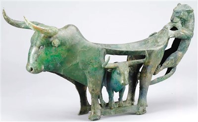 戰(zhàn)國牛虎銅案造型奇特,構(gòu)思新穎,既有中原地區(qū)四足案的特征,又具有濃郁的地方特色,是云南青銅文化藝術(shù)的杰作。