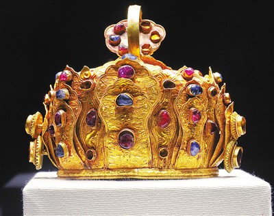 這件金冠出土于昆明市呈貢區(qū)王家營沐崧夫婦合葬墓,是沐氏家族顯赫身份的體現(xiàn)。其造型呈半球形,由4層形似蓮花瓣的薄金片累疊而成。冠面鑲嵌紅、藍、綠、白等各色寶石50多粒,絢麗奪目。冠兩側(cè)各有小孔兩個,用4支金簪穿入冠內(nèi)發(fā)髻之中以固定冠身。此冠融捶揲、鏨刻、鏤空、鑲嵌、焊接等多種工藝技法于一身,反映了明代金器制作水平的高超,更顯現(xiàn)出王侯之物的華貴。