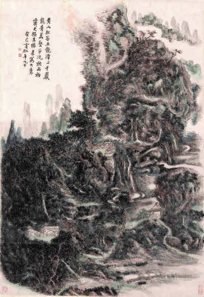 《黃山松谷五龍?zhí)丁伏S賓虹 紙本 設(shè)色 縱168.5厘米 橫120厘米 1953年中國美術(shù)學(xué)院藏
