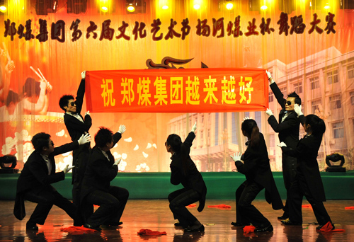 舞蹈比賽現場設在具有濃郁舞蹈氛圍的裴溝煤礦,5月31日,來自裴溝煤礦、白坪公司等18個單位的21支舞蹈隊一決雌雄。裴溝煤礦選送的舞蹈《小伙·四弦·馬纓花》,充滿了生動、歡趣、幽默、和諧的情節,表現出一個使人會心或暢懷的幽默場景,從而給人以精神上的享受。鐵運處選送的舞蹈《印度新娘》那妖嬈動人的舞姿、炫麗閃耀的服裝、悠揚迂回的音樂,營造出了濃郁的東南亞情調。現場,最為搶眼的是白坪煤業選送的《吉祥哈達獻鄭煤》。奔放的藏族姑娘們帶來了她們的祝愿,清澈的眼眸、輕盈曼妙的身姿,為鄭煤送來了吉祥與祝福。