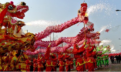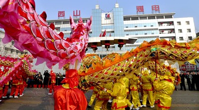 彩車絢麗,秧歌裊娜,人潮涌動(dòng),歡天喜地。2月17日(正月十五)上午,西山煤電集團(tuán)公司元宵節(jié)春滿西山街頭文化展演活動(dòng)在西礦大街激情上演。上午9時(shí),西山煤電集團(tuán)公司辦公樓門前,在上萬(wàn)名職工群眾的熱切期待中,西山煤電集團(tuán)公司領(lǐng)導(dǎo)金智新、薛道成為兩條色彩斑斕的長(zhǎng)龍點(diǎn)睛,預(yù)示著西山煤電集團(tuán)各項(xiàng)事業(yè)生機(jī)勃勃、蒸蒸日上。點(diǎn)睛之后,兩條長(zhǎng)龍口吐焰火,盤旋而起,整個(gè)西礦大街隨之變成一片歡樂的海洋。