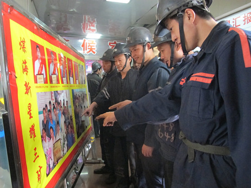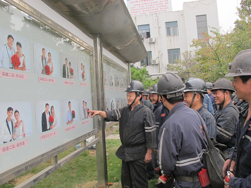 該礦近期評選了20名年度安全明星職工,拍安全好夫妻48寸婚紗照,36寸全家福,制作安全明星集錦畫冊,在先進人物文化長廊展出,深受廣大職工歡迎。圖為國投新集三礦掘進三隊職工下井前在觀看礦級先進人物光榮榜。