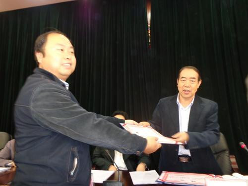 陜西省作協(xié)主席賈平凹(右)為陜西煤炭化工集團作協(xié)副主席張春喜發(fā)聘書