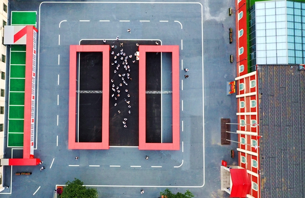 位于室外的第三單元學史力行見行動大課堂,“永遠跟黨走,奮進新征程”“心系群眾辦實事,聚焦發展解難題”主題系列展組成“100”的圖案,象征著建黨100周年。
