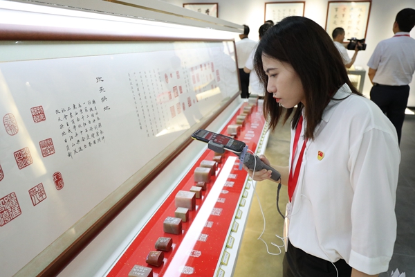 百枚篆刻、百枚印章陳列在展廳的中心位置,左側凝煉的四字篆刻由礦區5名退休黨員歷時15天完成,內容展現了1921年到2021年每年的重大事件。右側的百枚印章則以革命思想精神篇、農業農村篇、脫貧攻堅篇、從嚴治黨篇等十個序列的主題來呈現。