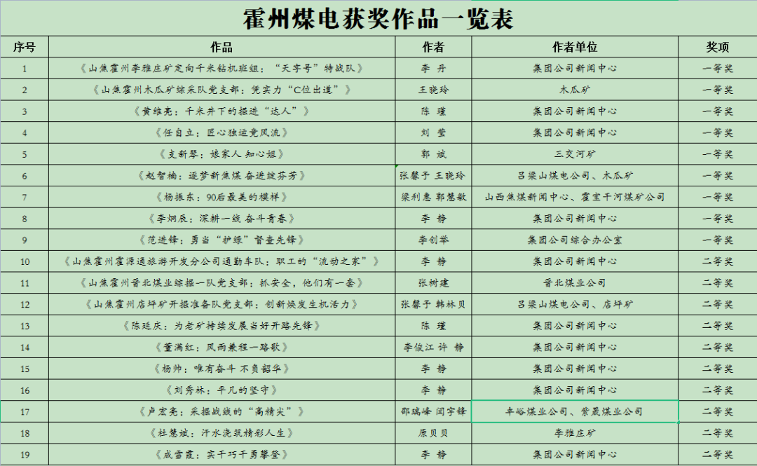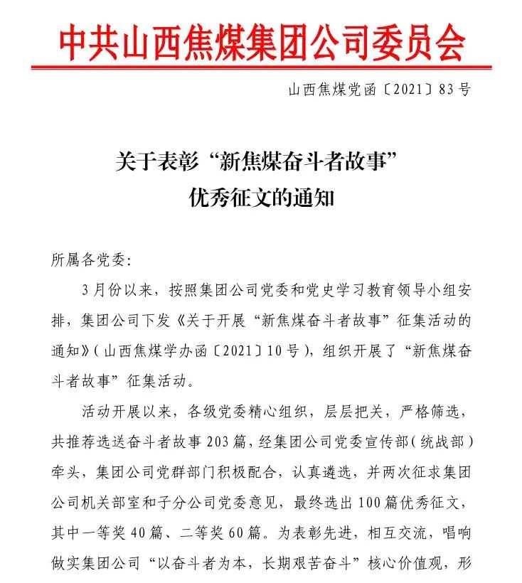 12月10日,山西焦煤黨委下發《關于表彰“新焦煤奮斗者故事”優秀征文的通知》,共評選表彰了100篇優秀征文。其中,一等獎40篇,二等獎60篇。霍州煤電共有9件征文作品榮獲一等獎,10件征文作品獲二等獎。