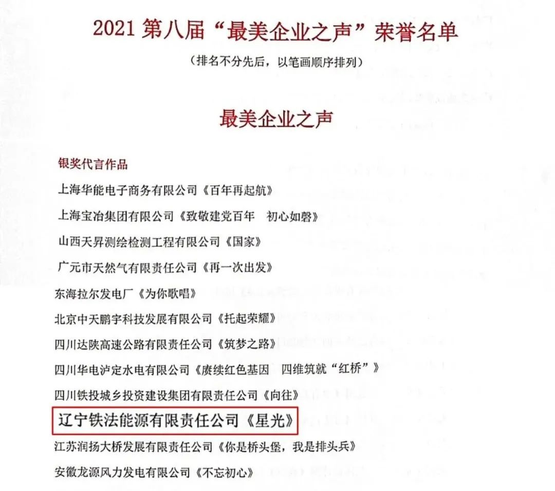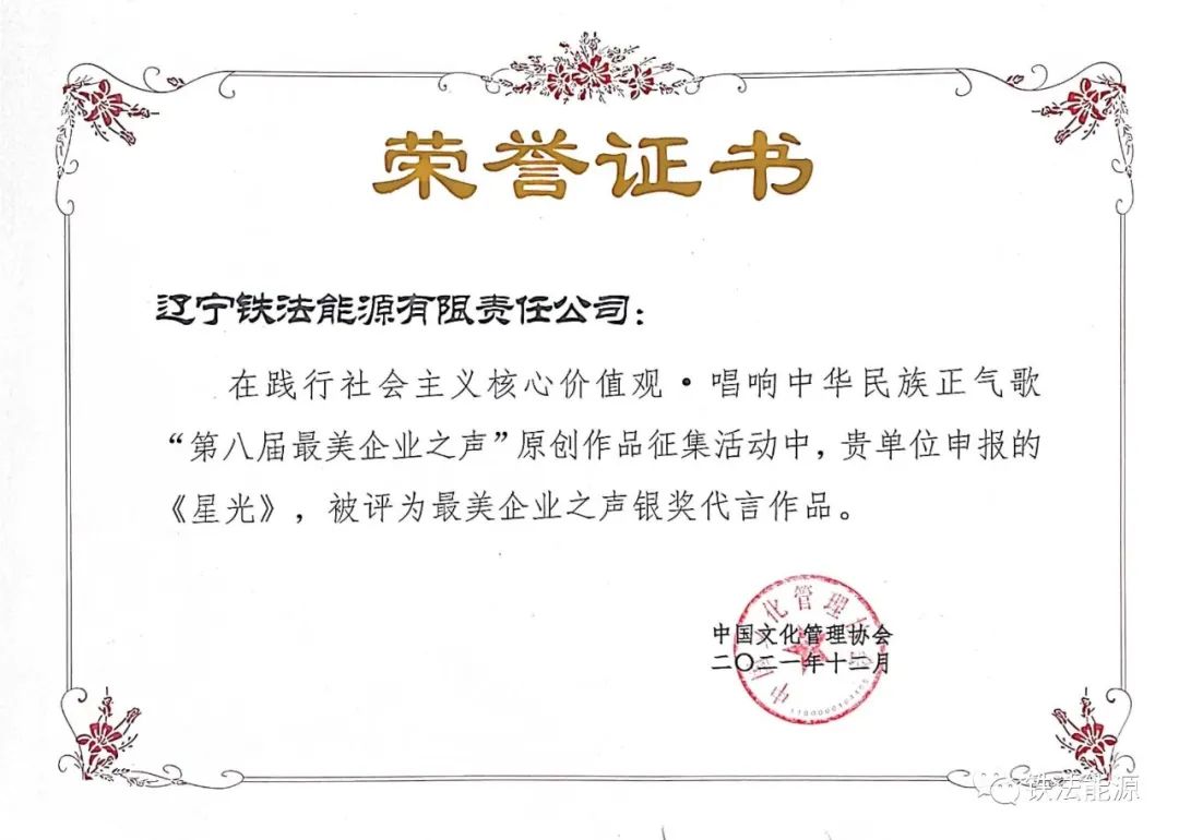 其中,遼寧鐵法能源公司榮獲“新時代黨建+企業文化示范單位”榮譽稱號,鐵法能源公司申報的慶祝建黨百年MV作品---《星光》榮獲“第八屆最美企業之聲”銀獎代言作品,并在光明網“最美企業之聲”專欄進行展示展播。