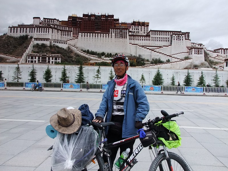 王佩科衣著樸素,臉膛黝黑,顯得精神矍鑠。一個碩大的背包將老王映襯得很瘦小。他的旁邊有一輛越野自行車,車籃里有兩三個礦泉水瓶子,車后有兩個籮筐,放著老王的帳篷等行李?;j筐旁邊分別有兩面醒目的小紅旗,上面寫著低碳生活宣傳環(huán)保、神州健身萬里行。王佩科說,2013年5月28日,他從攀枝花騎單車出發(fā),途經(jīng)云南麗江,西藏拉薩,青海青海湖,甘肅蘭州,寧夏銀川,內(nèi)蒙的巴彥淖爾,包頭,呼和浩特。河北木蘭圍場,遼寧沈陽,吉林長春,黑龍江的哈爾濱太陽島。吉林的吉林市,遼寧的大連。山東煙臺,河南鄭州,蘭考,湖北武漢,湖南荊州,重慶,貴州的遵義,云南的昭通巧家。四川會理,攀枝花。歷時近半年,行程一萬兩千多公里。