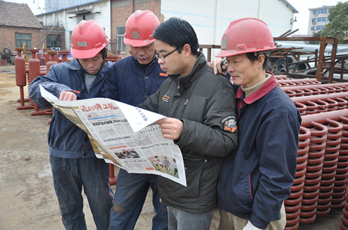 圖為12月16日該集團工程建設公司狀元勞模王發猛與工友一起分享刊發在《淮北礦工報》上講述自己成長事跡的報告文學。