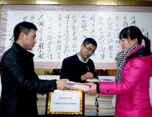 該礦團委以捐贈一本好書,奉獻一份愛心,情系貧困山區,傳遞幽幽書香為宗旨,將具有科普性、知識性、趣味性的課外讀物500余冊捐贈給貧困山區的兒童,讓貧困山區的兒童分享讀書的快樂,實現貧困山區孩子的讀書夢。一些青工還在書中夾了小紙片,寫下對山區兒童的祝福。圖為青工捐書時的場景。
