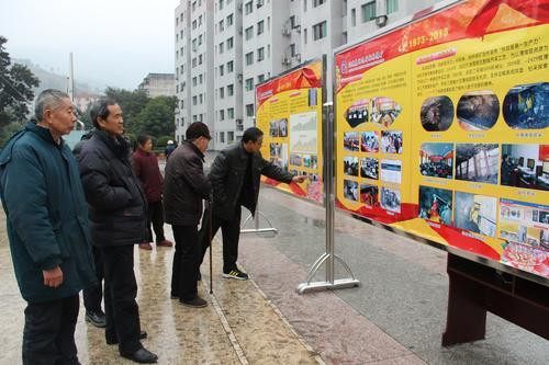 在每一塊展板前,職工群眾駐足細(xì)看,在那些黑白色或發(fā)黃的老照片中仔細(xì)地辨認(rèn)著,時(shí)不時(shí)發(fā)出這個(gè)人原來是某某的驚喜聲。一些退休老職工看著投產(chǎn)大會(huì)和第一噸煤炭出井等照片時(shí),更是深情地回憶和述說著當(dāng)年的激情歲月。一群年輕人匯集在科技板塊前,眉飛色舞地暢談著礦山未來的發(fā)展。