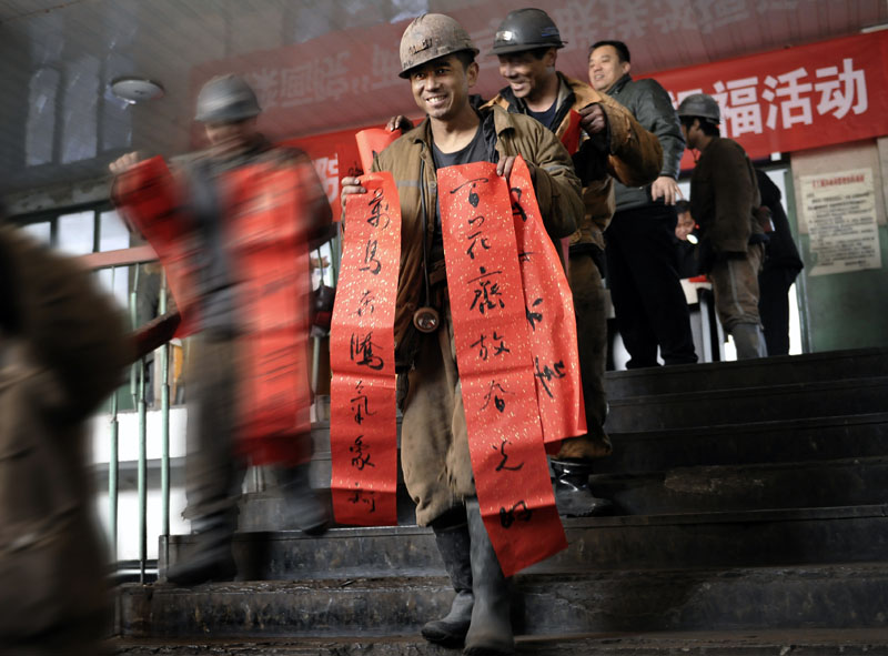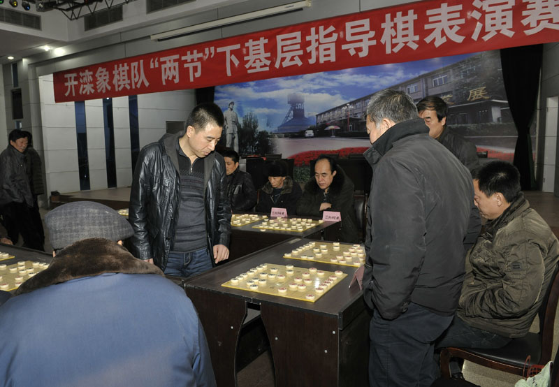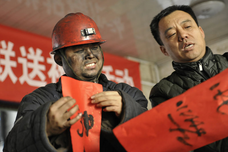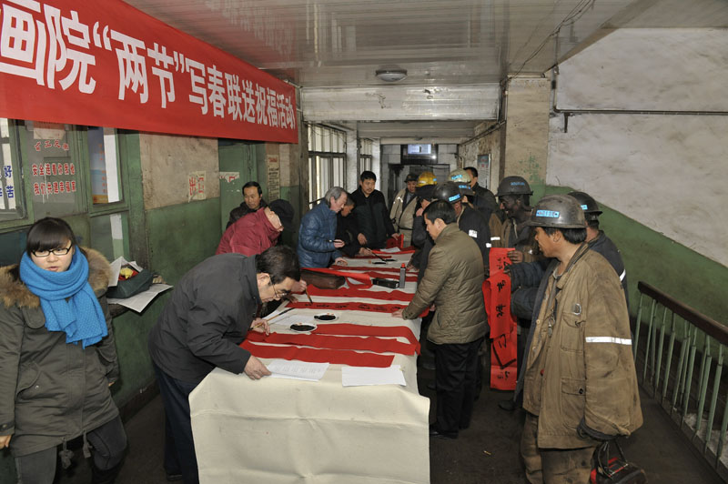 1月13日,開灤畫院的書畫家和開灤象棋隊的棋手在文體中心主任陳寶玉的帶領下來到了趙礦公司,拉開了節期送歡樂、送祝福下基層活動的序幕。中午時分,開灤畫院的4名書畫家早早來到趙礦公司井口,他們擺好紙硯、提筆凝神、揮毫潑墨,在一張張大紅的灑金宣紙上,寫下了一副副贊美祖國昌盛、暢想美好明天;開灤改革新貌、期盼美好未來;鄰里和睦、家庭幸福的對聯,兩個多小時書畫家們即興寫對聯200多副。剛剛上井工人師傅們聚攏在桌案前,爭前恐后,手擎灑金大紅的對聯,喜悅之情溢于言表。