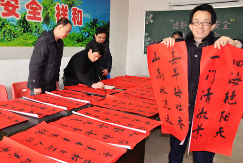 1月23日,安徽淮北礦業朱仙莊礦書法愛好者正揮毫潑墨為職工書寫春聯。春節前夕,該礦組織書法愛好者深入車間班組為職工免費書寫春聯。