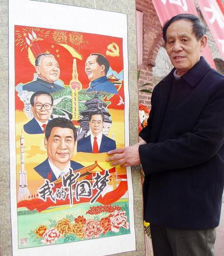 2014年1月27日,安徽淮北礦業(yè)集團(tuán)臨渙煤礦的剪紙藝人周學(xué)才在介紹新近完工的剪紙作品我的中國(guó)夢(mèng)。