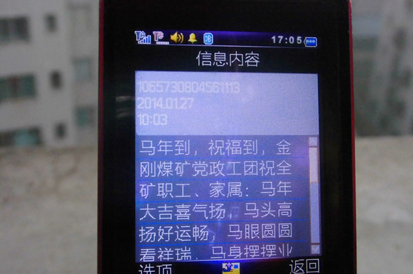 馬年到,祝福到,金剛煤礦黨政工團祝全礦職工、家屬:馬年大吉喜氣揚,馬頭高揚好運暢,馬眼圓圓看祥瑞,馬身擺擺業登高,馬尾掃掃體健康,馬聲震震顏歡笑;新春喜慶是必然,玩樂適度別傷感,節后及時把礦返,搞好安全與生產,力爭馬上去掙錢,馬年和諧福滿天!臨近春節,川煤集團達竹公司金剛煤礦的廣大職工都收到礦黨政工團的新年送祝福短信。