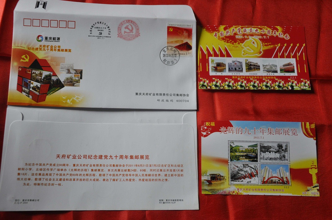 這次集郵展,特別設(shè)計(jì)印制了慶祝建黨90周年紀(jì)念封1200枚、紀(jì)念張12000份。反映中國革命歷程的紀(jì)念張1枚,反映天府落煤方式、職工工作生活環(huán)境變化的紀(jì)念張1枚;印制的紀(jì)念封,貼上慶祝建黨90周年的郵票、加蓋了重慶慶祝建黨90周年的紀(jì)念戳,特意選用了北碚朝陽路的郵政日戳,選擇朝陽寓意中國共產(chǎn)黨如東升的旭日、寓意天府礦工心向黨。紀(jì)念封、紀(jì)念章贈給觀展并簽名的師生、職工群眾,寄給公司郵協(xié)每位會員,寄給全國煤炭系統(tǒng)部分集郵愛好者、重慶市郵協(xié)、北碚區(qū)郵協(xié)、北碚老年郵協(xié)、西南大學(xué)郵協(xié)等集郵愛好者,深受集郵愛好者歡迎并得到內(nèi)行的好評。