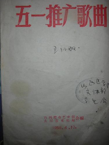 3月15日,筆者在河北省石家莊舊書市場看到了一冊上個世紀五十年代出版的《五一推廣歌曲》小冊子。這本推廣歌曲為山西群眾藝術館和太原市文化局合編,時間為1958年4月10日。從時間上看,這是五一勞動節前夕文化部門為慶祝五一勞動節而專門編輯下發的,對基層開展五一歌曲演唱活動具有很大的指導作用。