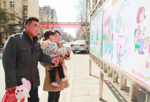 山東能源新礦集團協莊煤礦以貼近群眾、貼近生活、貼近基層為導向,積極開展溫馨化、個性化婚育新風進萬家宣教活動。圍繞群眾所需,通過設立計生宣傳一條街,制作圖文并茂的宣傳牌板和進家入戶送關愛等形式,讓職工群眾及時了解人口計生動態,引導廣大育齡群眾樹立科學、文明、進步的婚育觀念,不斷提升計生工作水平。圖為社區居民觀看計生宣傳漫畫。