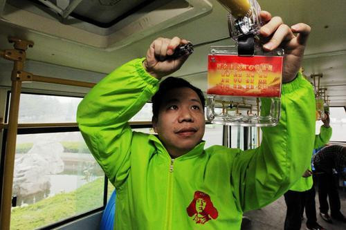 3月26日,皖北煤電集團恒源礦青年義工們在車上安設40副塑料拉手,拉手上印有社會主義核心價值觀、雷鋒精神等內容,形成了一道靚麗的正能量微展板風景線。