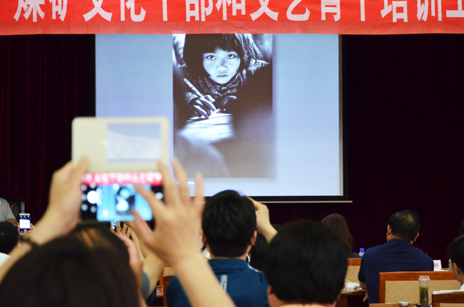 著名攝影家、中國文藝志愿者協會副主席解海龍與學員分享了他用鏡頭記錄貧困家庭、偏遠山村教育狀況的經歷。他分析了攝影“真、新、美、深、難”的五個階段,介紹了攝影藝術與宣傳公益事業、與推動希望工程發展結合的案例,詳細地講述了改變數百萬兒童命運的一張張照片背后的感人故事。