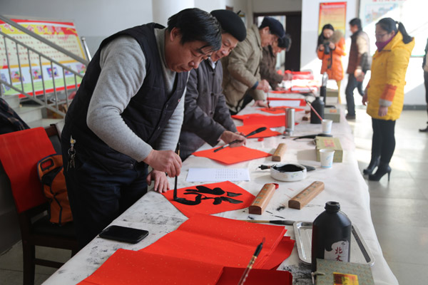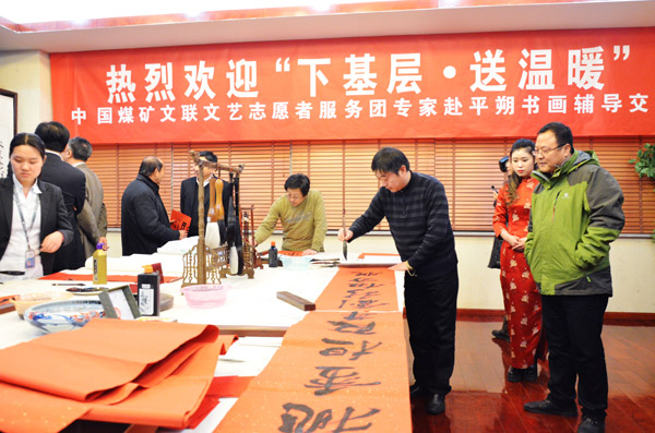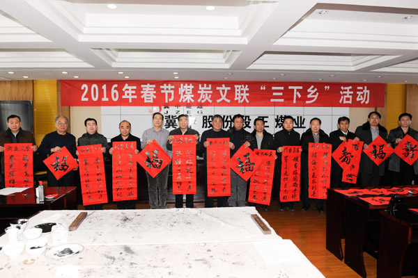 中國煤礦書法家協會積極響應中國書協關于2016年元旦春節期間開展“萬名書法家送萬‘福’進萬家”公益活動的通知精神,認真組織煤炭系統各企業書法組織開展送萬‘福’進萬家活動。1月31日,由中國煤礦文聯主辦,中煤平朔集團公司承辦的“走基層·送溫暖”中國煤礦文聯文藝志愿服務走進平朔活動在平朔礦區舉行。活動現場氣氛熱烈,藝術家們揮毫潑墨,為平朔礦區職工寫“福”字、寫春聯,邊創作書畫作品邊和平朔礦區的書畫愛好者交流創作經驗,筆會交流活動共書寫“福”字200多個,春聯60多套,創作書法作品50多件、美術作品10多件。藝術家們用飽蘸喜氣墨汁的畫筆創作出一件件飽含誠意的書畫作品,為平朔礦區職工紅紅火火的生活送上美好的祝愿。