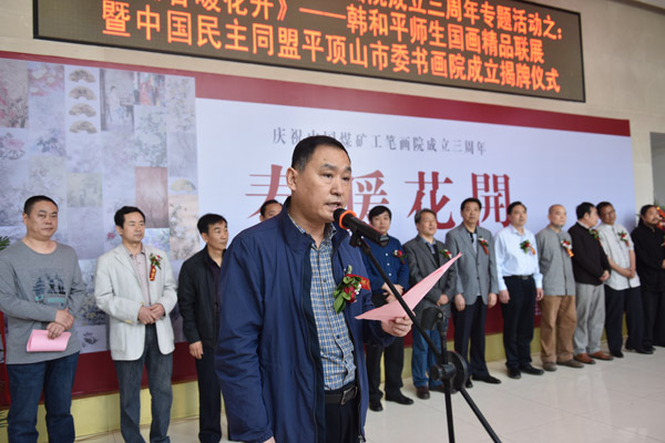 儀式首先由中國(guó)平煤神馬集團(tuán)工會(huì)副主席、文聯(lián)主席張帆致辭:向“《春暖花開》韓和平師生畫展”的隆重開幕表示最熱烈的祝賀!也對(duì)此次畫展的如期舉辦和各位的到來表示深深的謝意和熱烈歡迎!藝術(shù)家們秉承傳統(tǒng)、博采眾長(zhǎng)、勤奮創(chuàng)作、勇于探索,在促進(jìn)和推動(dòng)全煤文化蓬勃發(fā)展方面,起到了應(yīng)有的作用。一批書畫愛好者頻頻在全國(guó)及省部級(jí)畫展中摘金奪銀,躋身全國(guó),成為煤礦獨(dú)特的文化名片。
