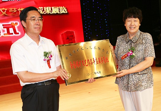 中國煤礦文聯(lián)主席梁嘉琨為平莊煤業(yè)集團(tuán)公司頒發(fā)特別貢獻(xiàn)獎,平莊煤業(yè)集團(tuán)總經(jīng)理、黨委副書記張志領(lǐng)獎