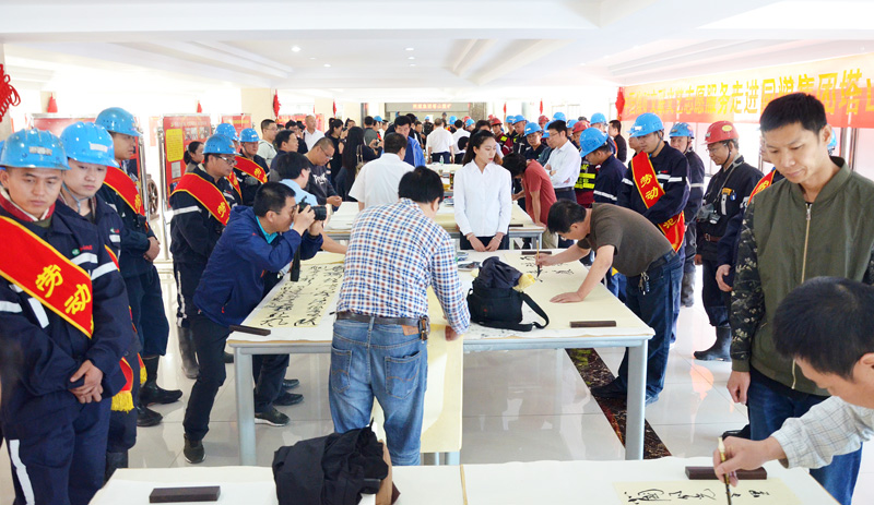 雖然文化長廊開闊明亮、通風蔭涼,但在書畫創作現場卻是一片熱鬧景象,志愿者們額頭冒著汗,卻不見筆端停歇,伴隨著一枚枚別致古樸的印章落在宣紙上,工人們樂呵呵地從志愿者手中接過“不忘初心”“天道酬勤”“家和萬事興”“厚德載物”“ 志存高遠”和水彩蘭花、國畫牡丹等一幅幅飽含祝福的書畫作品。