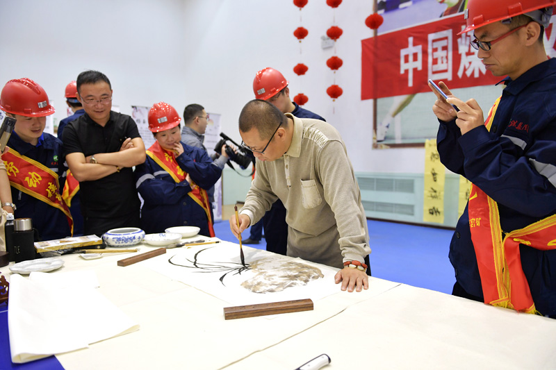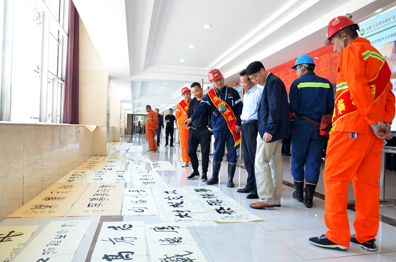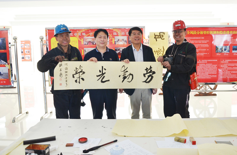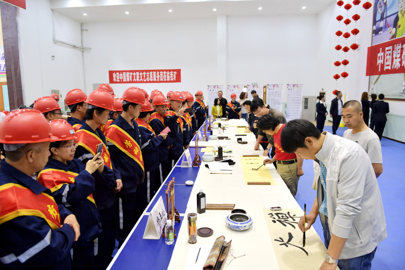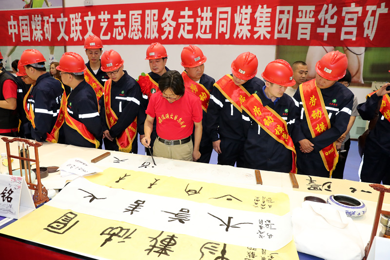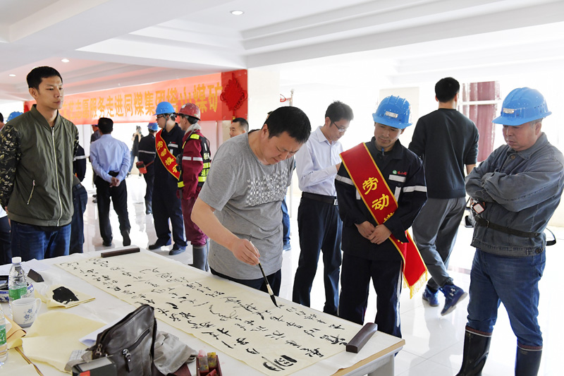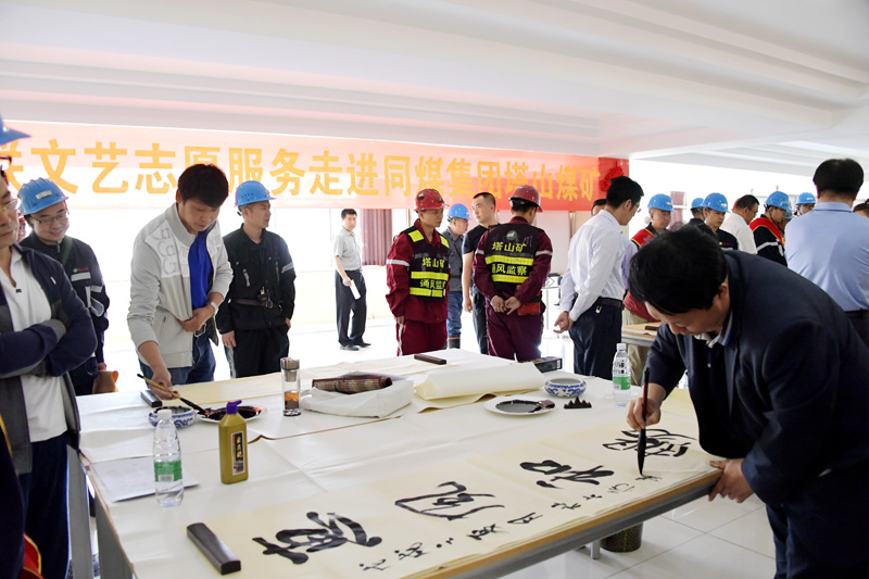 23日上午,志愿者們來到位列塔山循環經濟工業園區龍頭的現代化企業——塔山煤礦,礦區道路整潔、植被濃茂,在副井旁邊的文化長廊通道,已經有幾十名礦區勞模和職工代表在那里等候志愿者的到來。“一直想在家里掛上幾幅書法作品,這不,聽說今天中國煤礦文聯組織到礦上文藝志愿服務,我就過來了,已經準備好了幾句詞,一會兒請書法家們給寫寫。”一位正準備下井的工人說。