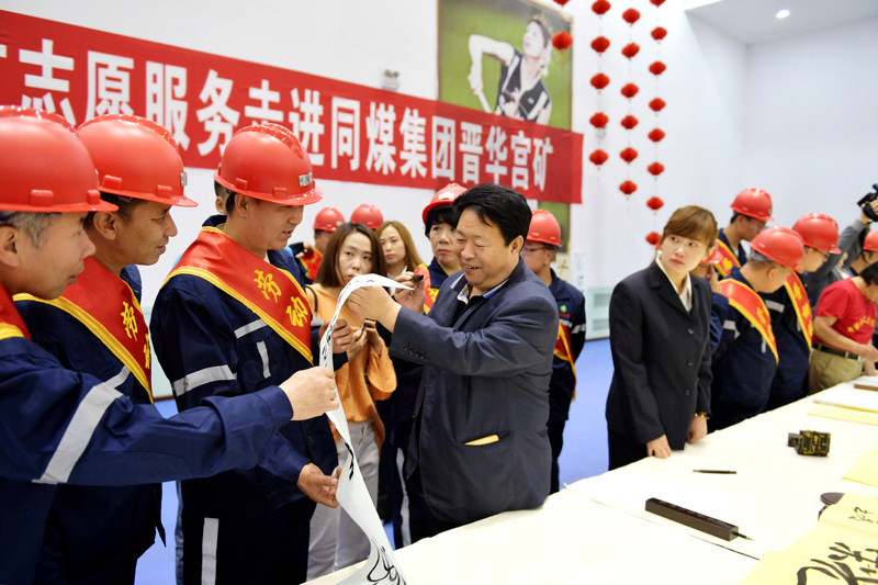 志愿服務期間,盛軍代表中國煤礦文聯向塔山煤礦和晉華宮礦分別贈送了“社會主義核心價值觀”書法作品。
