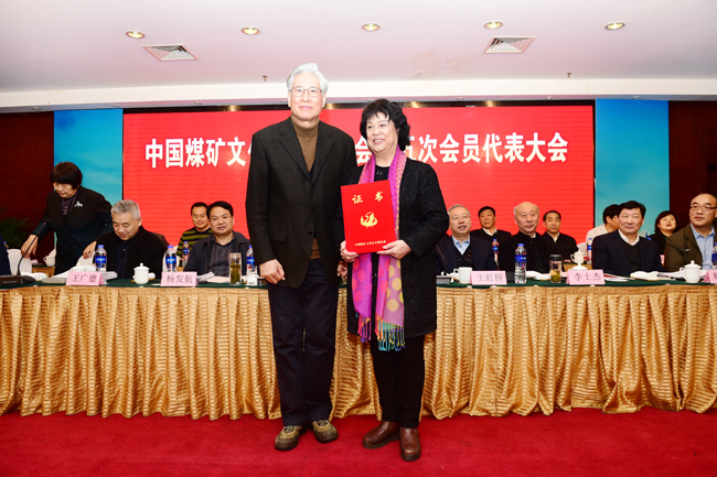 龐崇婭為新當(dāng)選的中國(guó)煤礦文聯(lián)秘書(shū)長(zhǎng)盛軍頒發(fā)證書(shū)