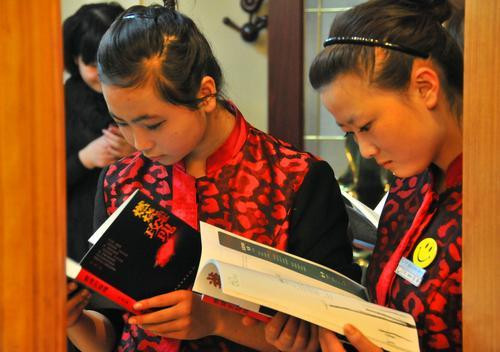 水若軒茶館工作人員在認真閱讀《燃燒的玫瑰》
