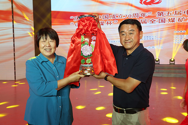 龐崇婭向山西焦煤集團贈送第五屆中國煤礦藝術節“特別貢獻獎”杯