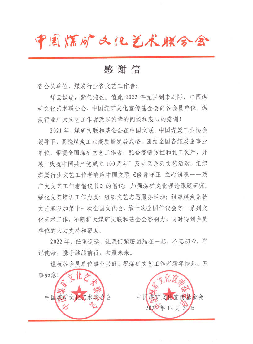 中國煤礦文化藝術聯合會、中國煤礦文化宣傳基金會向各會員單位、煤炭行業廣大文藝工作者致以誠摯的問候和衷心的感謝!