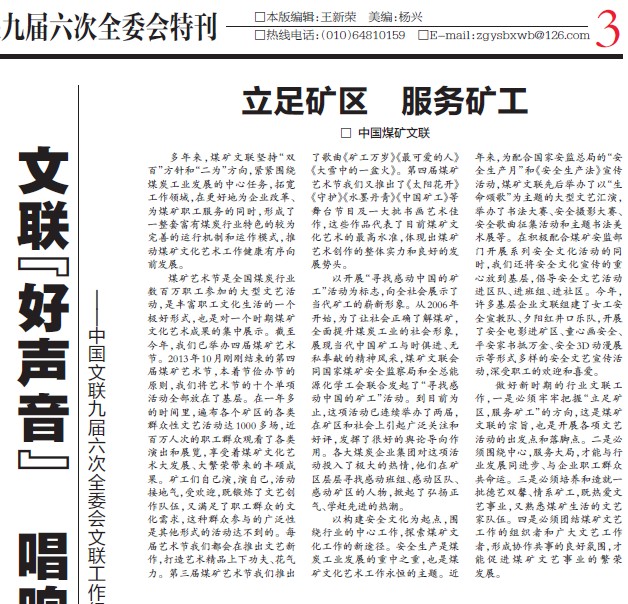 做好新時期的行業(yè)文聯(lián)工作,一是必須牢牢把握立足礦區(qū),服務(wù)礦工的方向,這是煤礦文聯(lián)的宗旨,也是開展各項文藝活動的出發(fā)點和落腳點。二是必須圍繞中心,服務(wù)大局,才能與行業(yè)發(fā)展同進(jìn)步、與企業(yè)職工群眾共命運(yùn)。三是必須培養(yǎng)和造就一批德藝雙馨、情系礦工,既熱愛文藝事業(yè),又熟悉煤礦生活的文藝家隊伍。四是必須團(tuán)結(jié)煤礦文藝工作的組織者和廣大文藝工作者,形成協(xié)作共事的良好氛圍,才能促進(jìn)煤礦文藝事業(yè)的繁榮發(fā)展。