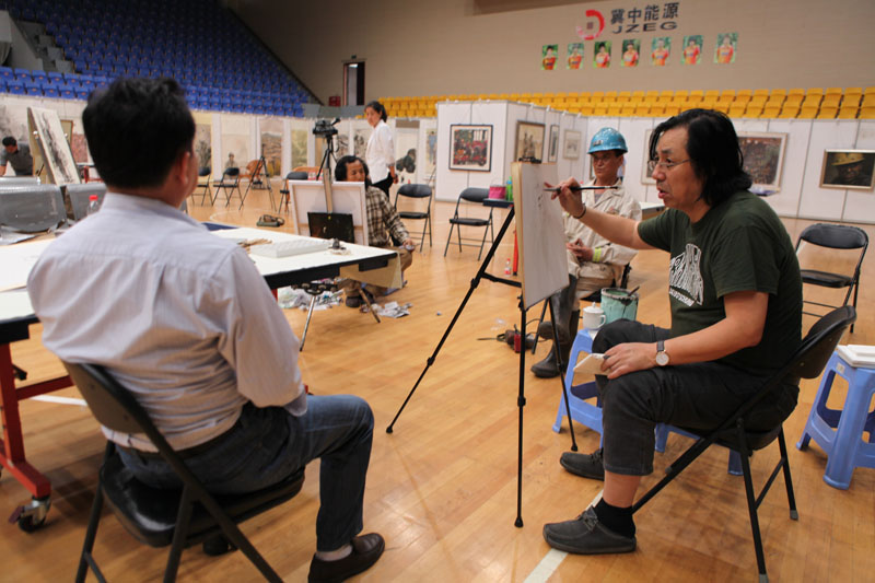從12日到17日,美術(shù)家們用了整整4天時(shí)間,集中精力進(jìn)行了礦工個(gè)體、群體形象的寫生創(chuàng)作,連原定去附近一處明代古居采風(fēng)的計(jì)劃也主動(dòng)要求取消了。他們每天連續(xù)揮毫七八個(gè)小時(shí),中午吃了工作餐,就回到作為畫堂的邢礦體育館為礦工寫生,常常直到天色將黑才撂下畫筆。