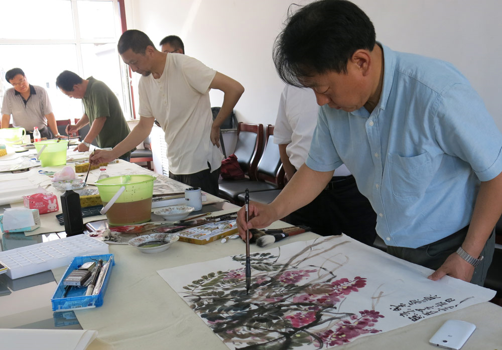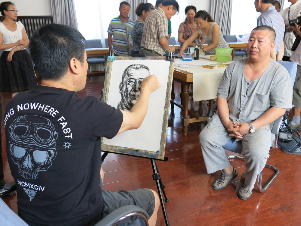 這次活動,煤礦美協做了精心準備,面對基層美術愛好者的具體情況,先后作了油畫藝術講座,山水畫藝術講座,以及在輔導交流互動中分別有山水,花鳥,書法,油畫,素描,速寫等的技法展示和寫生,有七十多位礦上職工參加了這次活動,他們分別圍繞他們自己喜歡的畫種,看老師作畫,屏氣凝神,全神貫注,生怕漏掉關鍵的幾筆處理。有的學員甚至一直追隨輔導老師來到礦業公司所屬的杏花礦,在礦工升井后的一間大棚里,看老師為滿身煤屑的礦工畫速寫,為這些可敬的人們畫吉祥的畫,寫祝福的條幅。
