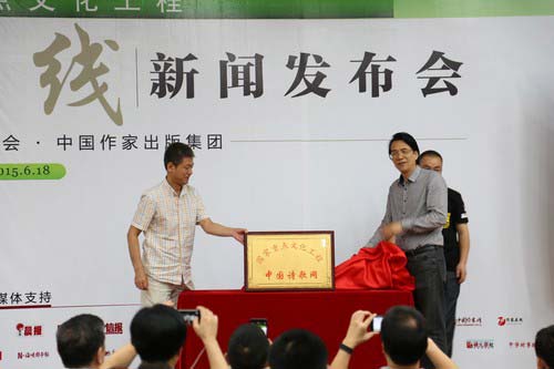 中國作協副主席何建明、文藝報總編輯梁鴻鷹為中國詩歌網揭牌