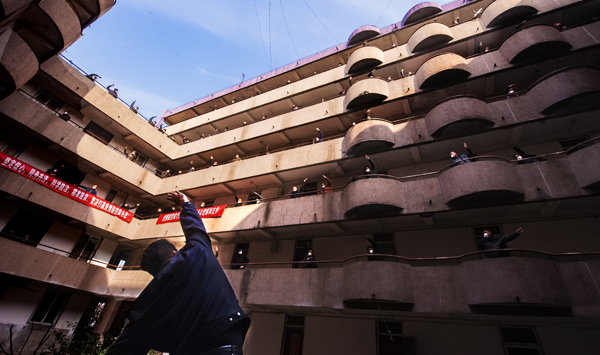 《復工之前》 疫情防控伊始,淮河能源煤業張集煤礦是安徽省首批復工的礦井。在保障媒電供應的過程中,這個礦積極有序的做到了安全生產和疫情防控兩不誤。圖為2020年3月4日,最后一批復工職工在礦隔離觀察點內參加集中體能訓練。銅質收藏 胡清風攝
