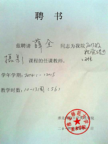 中國煤礦攝影家協會會員薛全日前被淮北師范大學美術學院聘為2014-2015年度攝影課程的任課教師。