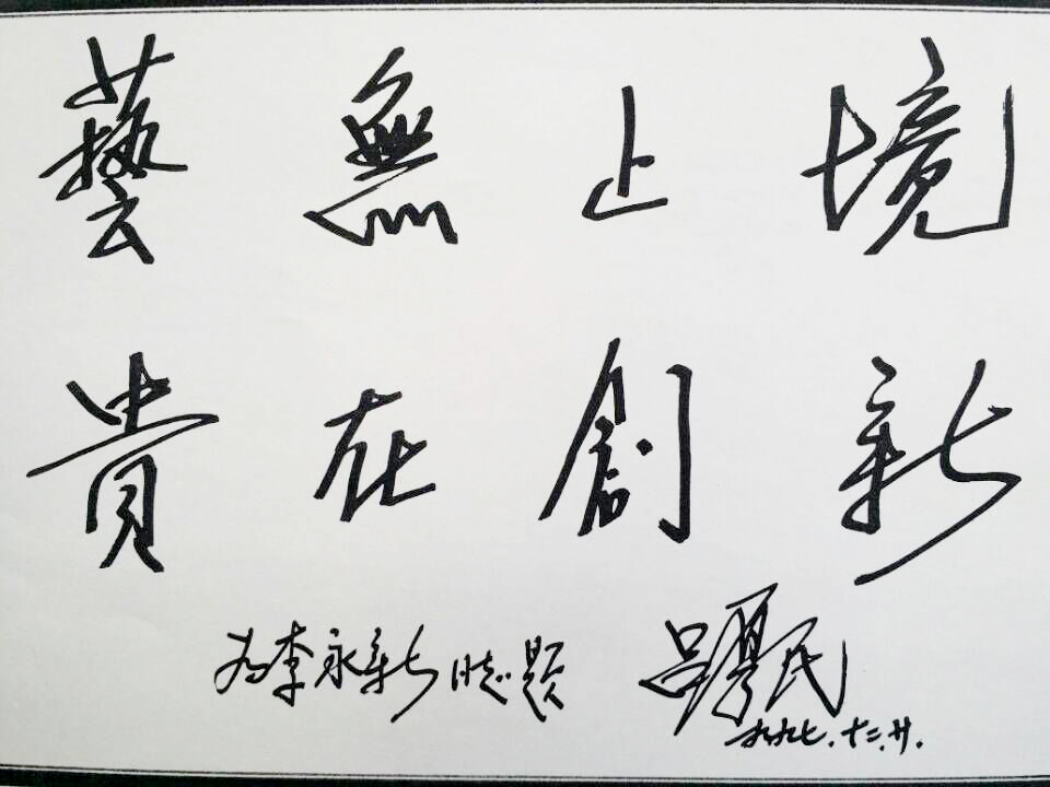 他問我在山西什么煤礦、從事攝影多長時(shí)間了、對(duì)攝影有何見解等等,我都一一做了回答。當(dāng)?shù)弥沂菙z影專業(yè)畢業(yè)、已有不少作品得到認(rèn)可,還在煤礦基層單位帶領(lǐng)一批攝影愛好者學(xué)攝影、辦展覽、幫單位出畫冊、積極參加和組織各類攝影賽事等等,呂老連連點(diǎn)頭稱贊做的好。不知不覺已近一個(gè)小時(shí)的時(shí)間了,怕影響呂老的工作,我主動(dòng)起身作別,并提出想要一個(gè)呂老的簽名,沒想到,呂老爽快地答應(yīng)了。他說:“就不用在本本上寫了,本本上有線條,寫出來影響效果”,于是,他拿出桌子的一張白紙,寫下了“藝無止境,貴在創(chuàng)新”。這八個(gè)字激勵(lì)著我在攝影創(chuàng)作上拼搏向前!