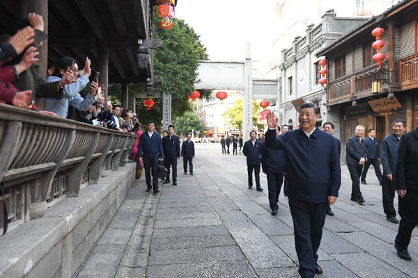 △2021年3月24日下午,中共中央總書記、國家主席、中央軍委主席習近平在福州三坊七巷歷史文化街區考察時,向游客和市民招手致意。