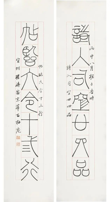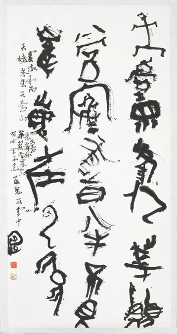 寫鐵線篆,須氣靜,蓄勢蓄力,有耐心,有韌勁,方能筆筆圓潤、筆力遒勁。楊濤君的鐵線篆脫胎于李斯《嶧山碑》、李陽冰《三墳記》、唐人《碧落碑》等經典碑刻;大篆則根植于三代吉金文。因此,他筆下鐵線篆的剛健婀娜與大篆的厚重恣肆,以及隸書行筆的波磔熔為一爐。線質扎實、勁健、蒼深,用筆峰巒起伏、遲澀飛動。不僅如此,他的草書以唐人狂草為本,兼及宋人草書韻致,取法高古,自有逸氣。