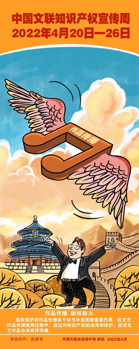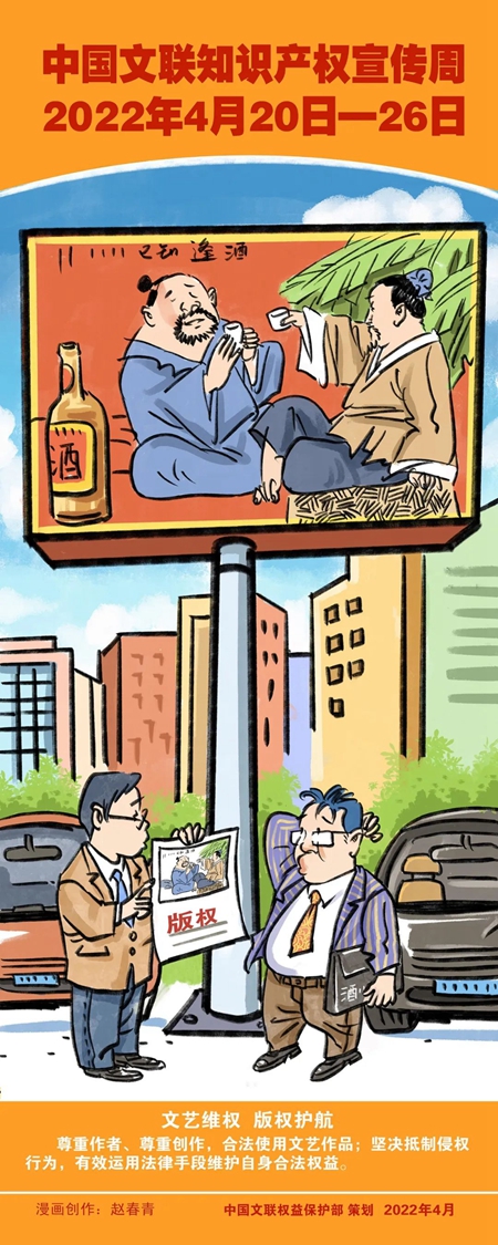 在第22個世界知識產權日來臨之際,“中國文聯知識產權宣傳周”活動于2022年4月20日正式啟動。中國文聯權益保護部圍繞“強化知識產權保護 激發文藝創新活力”主題策劃制作了宣傳海報漫畫,旨在學習貫徹黨的十九大和十九屆歷次全會精神,堅持以習近平法治思想為指導,認真落實習近平總書記在中國文聯十一大、中國作協十大開幕式上的重要講話精神,切實履行文聯組織自律維權職能,推進《中國文聯關于進一步加強文藝維權工作的指導意見》和中國文聯“八五”普法工作的實施。通過開展知識產權宣傳周活動在文藝界倡導尊重創作、鼓勵創新,不斷提升文藝界知識產權保護的意識和能力。