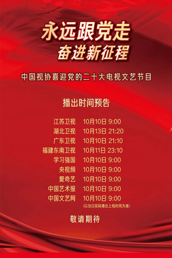 為迎接黨的二十大勝利召開,以文藝的形式反映新時代中國在經濟、政治、文化、社會、生態文明等各領域取得的光輝成就,展現廣大電視和網絡視聽藝術工作者在黨的領導下自覺承擔舉旗幟、聚民心、育新人、興文化、展形象的使命任務和昂揚向上的精神風貌,由中國電視藝術家協會、江蘇廣播電視總臺共同出品,中國文學藝術基金會、湖北廣播電視臺、廣東廣播電視臺、福建省廣播影視集團支持,中國視協主持人專業委員會、中國視協演員工作委員會協辦的“永遠跟黨走 奮進新征程——中國視協喜迎黨的二十大電視文藝節目”,已順利完成錄制工作,將于2022年10月10日起正式播出。