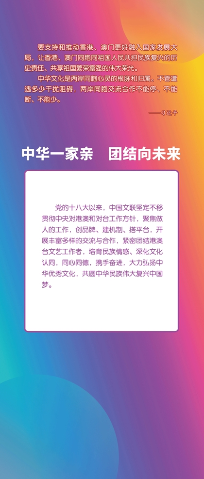新時代賦予新使命,新使命呼喚新擔當。中國文聯將繼續團結引領廣大文藝工作者緊密團結在以習近平同志為核心的黨中央周圍,同心同德、群策群力,不忘初心、砥礪奮進,不斷推動對外和對港澳臺工作邁上新的臺階,為實現中華民族偉大復興的中國夢貢獻力量。