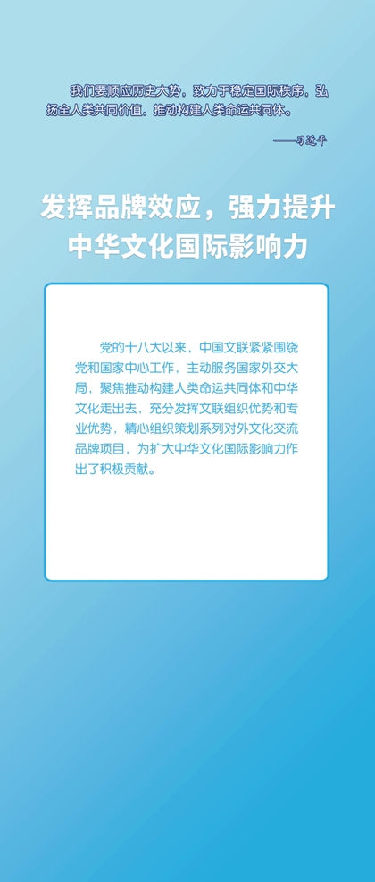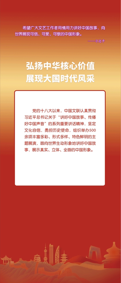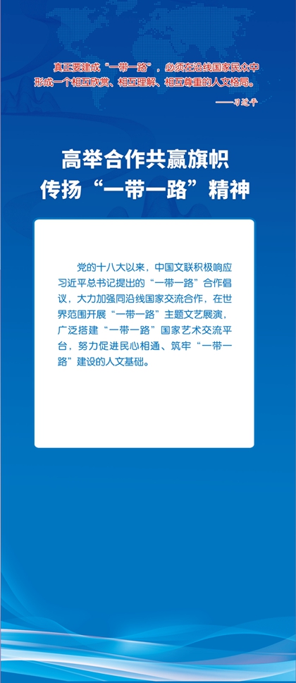 黨的十八大以來,在習近平新時代中國特色社會主義思想指引下,中國文聯堅定不移貫徹中央決策部署,圍繞中心、服務大局,遵循黨的外交方針和布局,以習近平總書記關于構建人類命運共同體、建設“一帶一路”、講好中國故事、推動世界文明交流互鑒等重要思想為引領,發揮組織優勢和專業優勢,堅持“請進來”與“走出去”相結合,組織開展深層次、多領域的人文交流和主題鮮明、內容豐富、形式多樣的文藝展演活動,努力推動中華文化走出去,擴大中華文化的國際影響力。同時,中國文聯堅決貫徹中央對港澳和對臺工作方針,聚焦“做人的工作”,發揮引領作用,廣泛團結港澳臺文藝組織、團體和文藝家,在共同弘揚和繁榮中華文化的過程中增進民族情感和文化認同,為筑牢中華民族命運共同體作出了應有的貢獻。