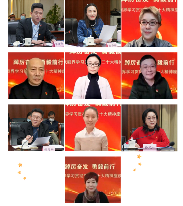 中國(guó)文聯(lián)黨組成員、副主席俞峰,中國(guó)劇協(xié)主席濮存昕,基層院團(tuán)的二十大代表王洪玲、楊霞云,中國(guó)劇協(xié)副主席尹曉東、馮玉萍、李樹(shù)建、楊鳳一、茅威濤、孟廣祿、柳萍、韓再芬、謝濤,中央戲劇學(xué)院、國(guó)家話劇院、北京人民藝術(shù)劇院、中國(guó)歌劇舞劇院、北京京劇院、中央音樂(lè)學(xué)院等院校、院團(tuán)的戲劇教育家、藝術(shù)家代表郝戎、侯巖松、王斑、陳小朵、張建峰、王麗達(dá),“全國(guó)中青年德藝雙馨文藝工作者”稱號(hào)獲得者谷好好,青年演員、新文藝群體代表王樂(lè)君等出席會(huì)議,紛紛暢談學(xué)習(xí)二十大精神的感悟。中國(guó)劇協(xié)顧問(wèn)王曉鷹,中國(guó)劇協(xié)副主席于魁智、王勇、沈鐵梅提交了書面發(fā)言。