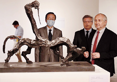 烏拉圭教育和文化部部長巴勃羅·達·西爾韋拉(右)、烏拉圭國家視覺藝術博物館館長恩里克·阿蓋爾(中)、中國駐烏拉圭大使王剛(左)欣賞吳為山雕塑《空谷有音——老子出關》