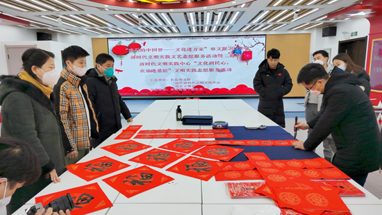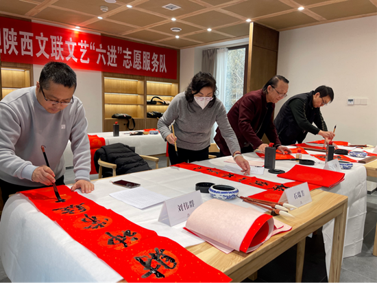 1月13日,由陜西省文聯(lián)主辦的“我們的中國(guó)夢(mèng)——送萬(wàn)福 進(jìn)萬(wàn)家”陜西省文聯(lián)文藝“六進(jìn)”書(shū)法志愿服務(wù)隊(duì)走進(jìn)趙公故里,書(shū)法藝術(shù)家們現(xiàn)場(chǎng)揮毫潑墨,為企業(yè)和職工送上新年的美好祝福。